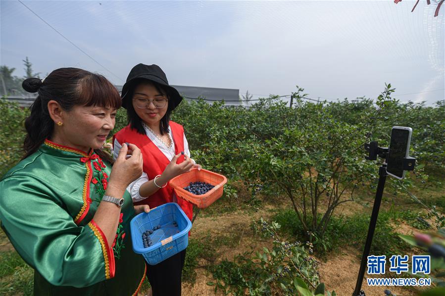 5月20日,長興縣林城鎮(zhèn)上獅村的藍(lán)莓種植幫扶基地內(nèi),青年志愿者與種植戶通過手機(jī)直播藍(lán)莓的采摘,并介紹當(dāng)?shù)厮{(lán)莓生長環(huán)境和品質(zhì),進(jìn)行網(wǎng)上銷售。新華社記者徐昱攝