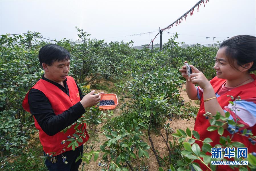 5月20日,長(zhǎng)興縣林城鎮(zhèn)上獅村的藍(lán)莓種植幫扶基地內(nèi),青年志愿者與種植戶通過(guò)手機(jī)直播藍(lán)莓的采摘,并介紹當(dāng)?shù)厮{(lán)莓生長(zhǎng)環(huán)境和品質(zhì),進(jìn)行網(wǎng)上銷售。新華社記者徐昱攝