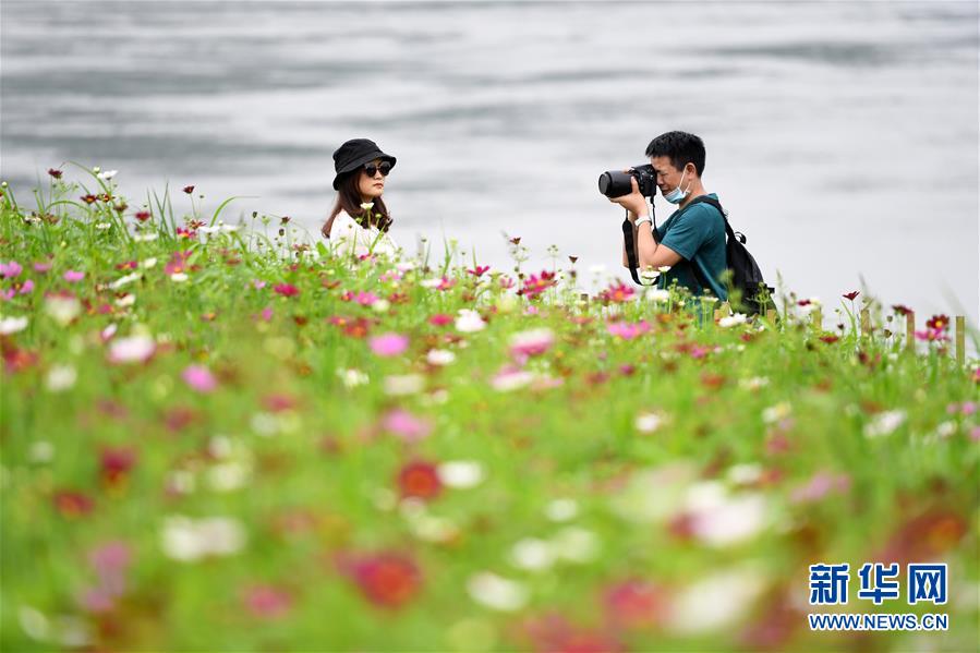 5月20日,在重慶市巴南區(qū)木洞鎮(zhèn)長江岸邊,游客在格桑花海中拍照留念。近日,重慶市巴南區(qū)木洞鎮(zhèn)長江岸邊的格桑花競相開放,吸引游客前來賞花觀景。新華社記者唐奕攝