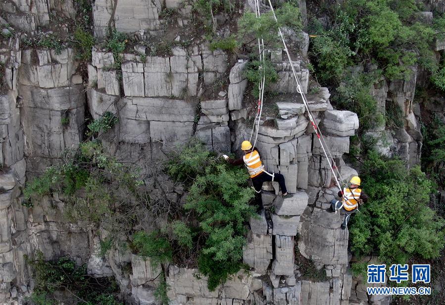 5月21日,捅山工胡軍從山頂垂降,準(zhǔn)備開始捅山作業(yè)。新華社記者郝源攝