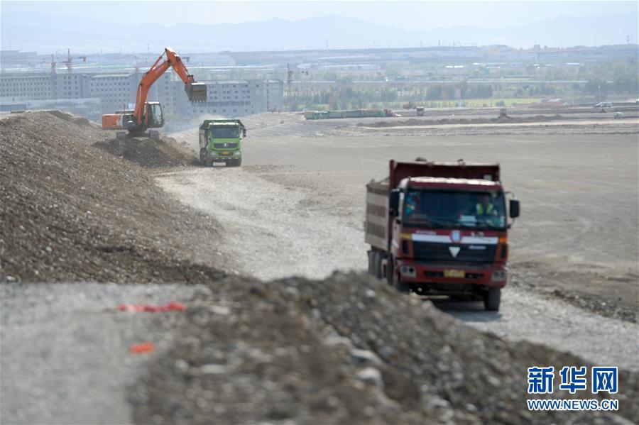 5月23日,在烏魯木齊機場改擴建工程施工現(xiàn)場,施工車輛在飛行區(qū)進行土方回填作業(yè)。新華社記者丁磊攝