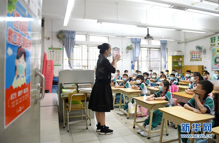 5月25日,廣州市荔灣區(qū)蔣光鼐紀(jì)念小學(xué)的老師在教學(xué)生防疫知識(shí)。當(dāng)日,廣州市各小學(xué)一至三年級(jí)學(xué)生正式開(kāi)學(xué)復(fù)課。至此,廣州市中小學(xué)各年級(jí)已全部開(kāi)學(xué)復(fù)課。新華社記者盧漢欣攝