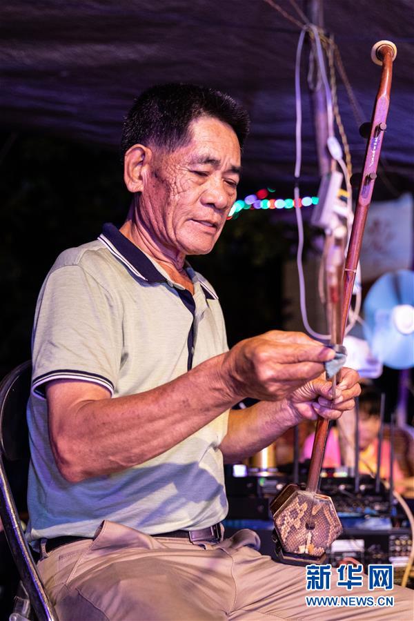 5月24日,海南臨高新風(fēng)人偶戲團(tuán)成員在演出前調(diào)試樂器。新華社記者張麗蕓攝