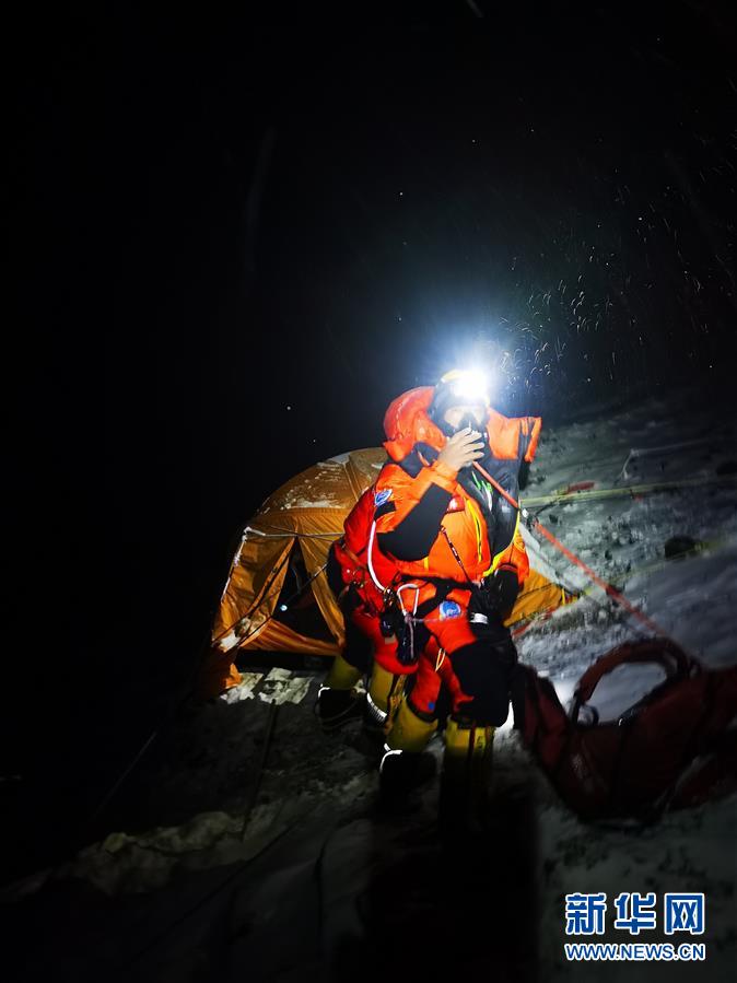 5月27日,在海拔5200米的珠峰大本營,2020珠峰高程測量登山隊(duì)總指揮、國家體育總局登山運(yùn)動管理中心副主任王勇峰正在和位于海拔8300米突擊營地的測量登山隊(duì)隊(duì)員通話。新華社記者孫非攝