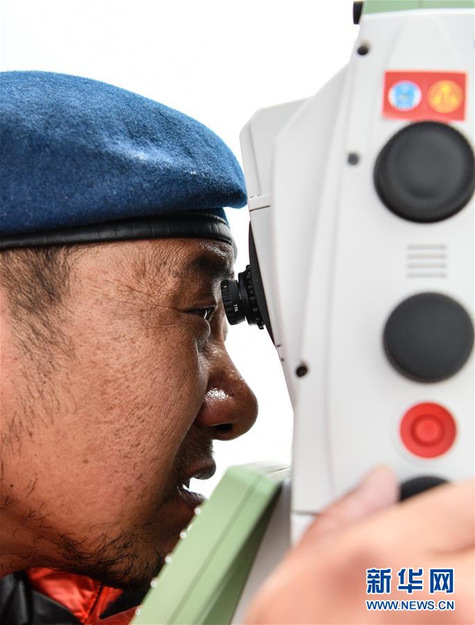 當(dāng)日,2020珠峰高程測量登山隊成功登頂后,在珠峰大本營的珠峰高程起算點,自然資源部第一大地測量隊隊員利用全站儀等儀器對珠穆朗瑪峰峰頂進(jìn)行交會觀測。