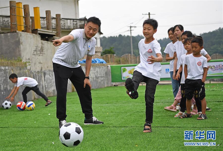 5月27日,在江西省貴溪市金屯鎮(zhèn)金屯村渡坊村小組,志愿者和留守兒童一起進(jìn)行體育活動(dòng)。新華社記者萬(wàn)象攝