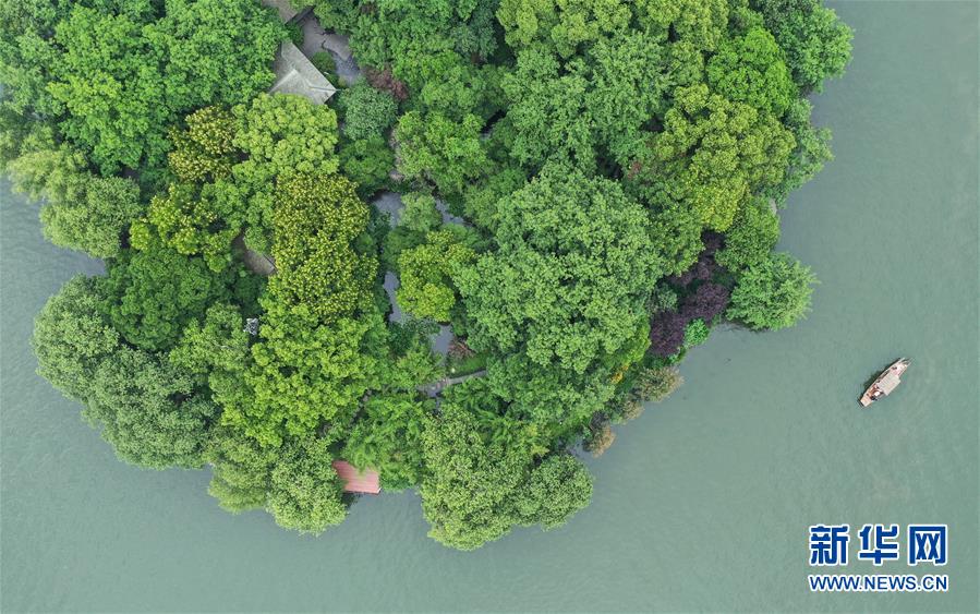 5月27日,船只在西湖湖心亭附近行駛(無人機照片)。隨著氣溫升高,杭州西湖綠意蔥蘢,展現(xiàn)出柔美的湖光山色。新華社記者翁忻旸攝