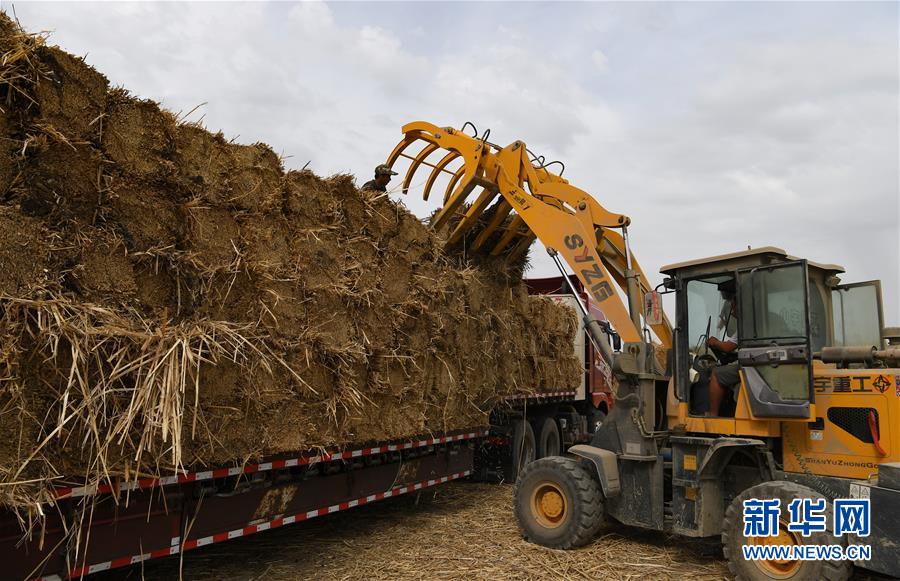 5月20日,在新疆博湖縣西南河口葦場,工人將打包成捆的蘆葦裝車。新華社記者宋彥樺攝