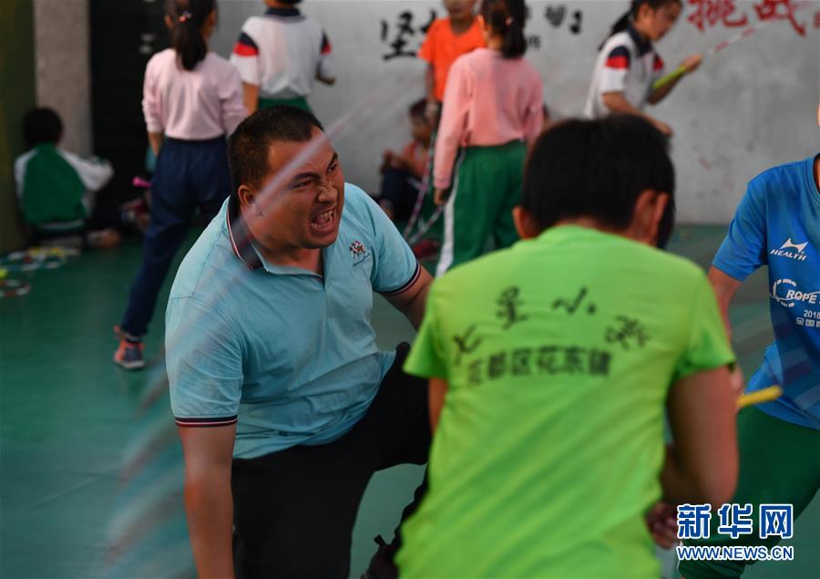 七星小學(xué)跳繩隊教練賴宣治(左)正大吼著激勵隊員訓(xùn)練。正是這位沒有接觸過專業(yè)跳繩訓(xùn)練的的體育老師把跳繩運動引入學(xué)校,十年不懈,領(lǐng)著孩子們從鄉(xiāng)村的小操場跳到世界的大舞臺(2019年11月18日攝)。新華社記者劉大偉攝