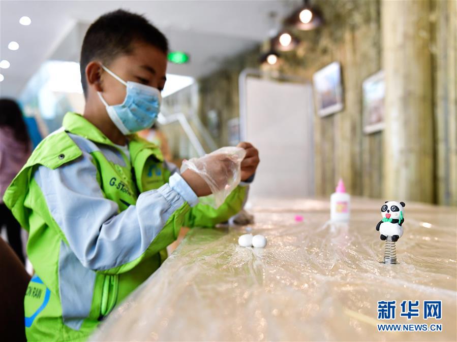 5月31日,小朋友在西寧熊貓館內(nèi)制作熊貓擺件。新華社記者張龍攝