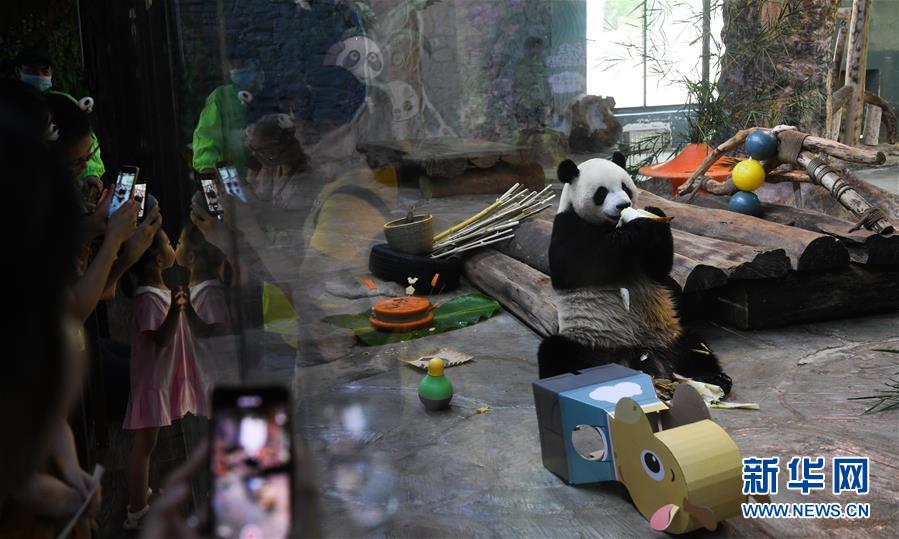 6月1日,小朋友在觀看大熊貓“舜舜”進(jìn)食。新華社記者楊冠宇攝