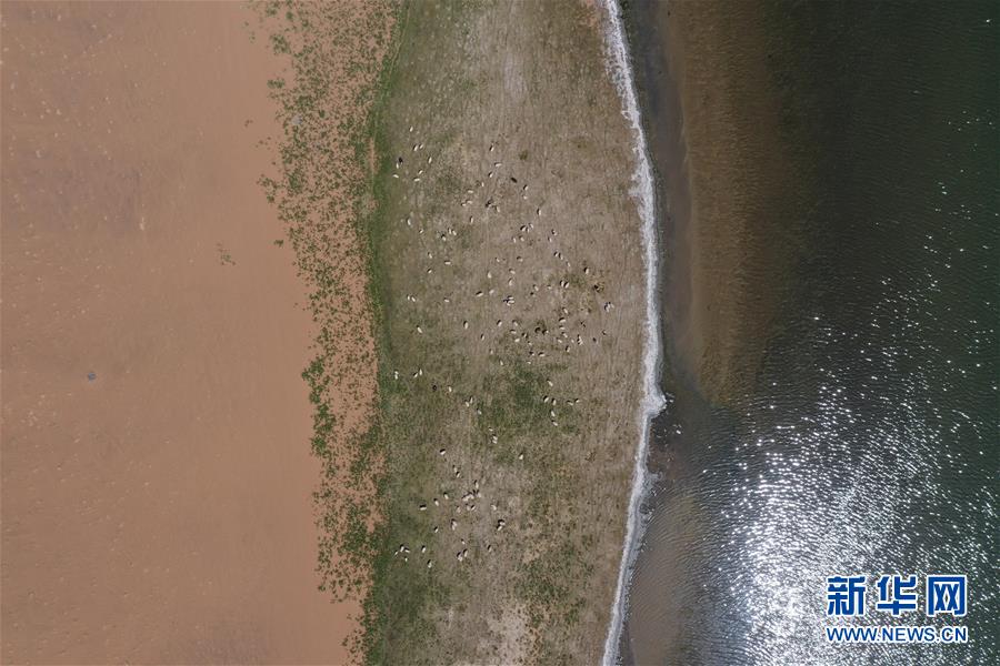 5月31日,羊群在巴丹吉林沙漠音德日圖湖湖畔休憩(無人機(jī)照片)。新華社記者徐欽攝。