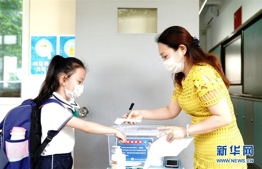 6月2日,上海閔行區(qū)鑫都小學,老師為一名一年級小學生量體溫。當日,上海小學一、二、三年級學生返校開學。新華社記者張建松攝。