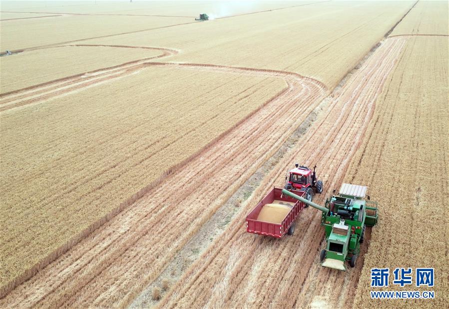 6月2日,在河南省黃泛區(qū)農(nóng)場(chǎng)九分場(chǎng)的麥田里,農(nóng)民操作大型收割機(jī)收獲小麥(無(wú)人機(jī)照片)。新華社記者李嘉南攝。