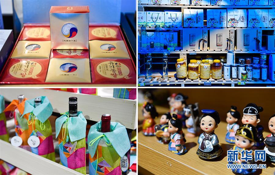 在延邊朝鮮族自治州和龍市“金達(dá)萊絲路”電商平臺實(shí)體店內(nèi)拍攝的帶有朝鮮族元素包裝的農(nóng)特產(chǎn)品及文創(chuàng)產(chǎn)品(拼版照片,5月7日攝)。新華社記者許暢攝。