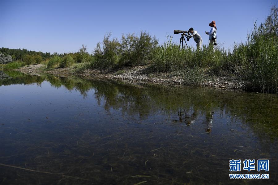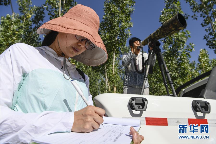 6月3日,李學(xué)明(左)和同事張海榮在監(jiān)測(cè)記錄黃河濕地的鳥類活動(dòng)。新華社記者馮開(kāi)華攝。