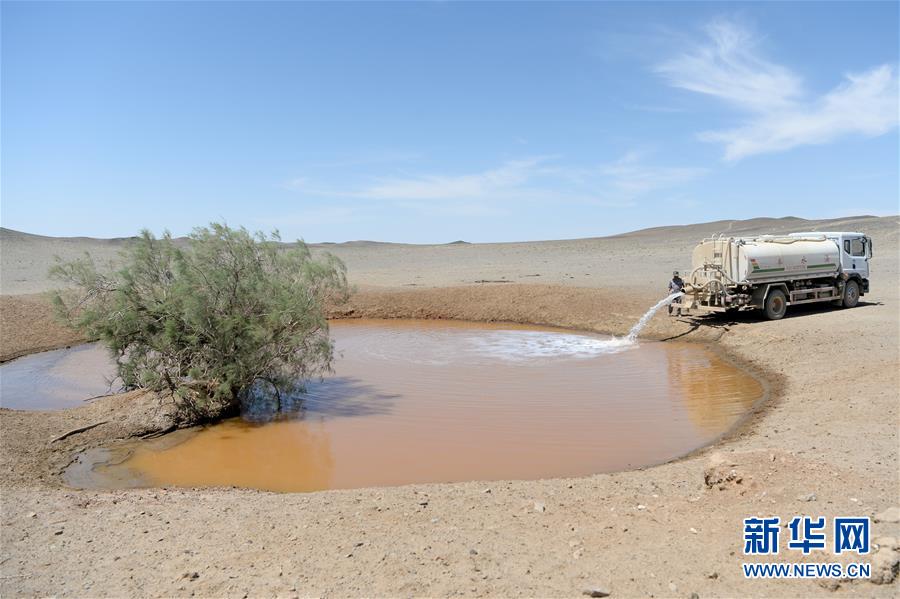 在新疆卡拉麥里山有蹄類野生動物自然保護區(qū),管護員為水源地灌水(6月3日攝)。新華社記者丁磊攝。