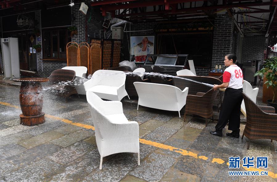 6月8日,在廣西陽朔縣西街,一家商鋪工作人員在沖洗被洪水浸泡的桌椅。6月6日至8日,廣西陽朔縣普降暴雨,局部降特大暴雨,全縣9個(gè)鄉(xiāng)鎮(zhèn)出現(xiàn)洪澇災(zāi)害。目前,全縣正有序開展災(zāi)后生產(chǎn)生活恢復(fù)。新華社記者陸波岸攝