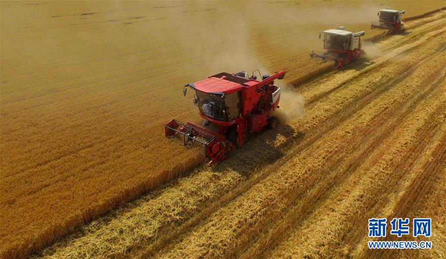 6月8日,聯(lián)合收割機(jī)在河北省南和縣閆里鄉(xiāng)閆里村麥田進(jìn)行夏收作業(yè)(無人機(jī)照片)?!叭摹逼陂g,河北省預(yù)計(jì)組織和調(diào)度小麥聯(lián)合收割機(jī)、拖拉機(jī)、夏玉米播種機(jī)等200萬臺(tái)農(nóng)業(yè)機(jī)械投入作業(yè)。新華社記者朱旭東攝