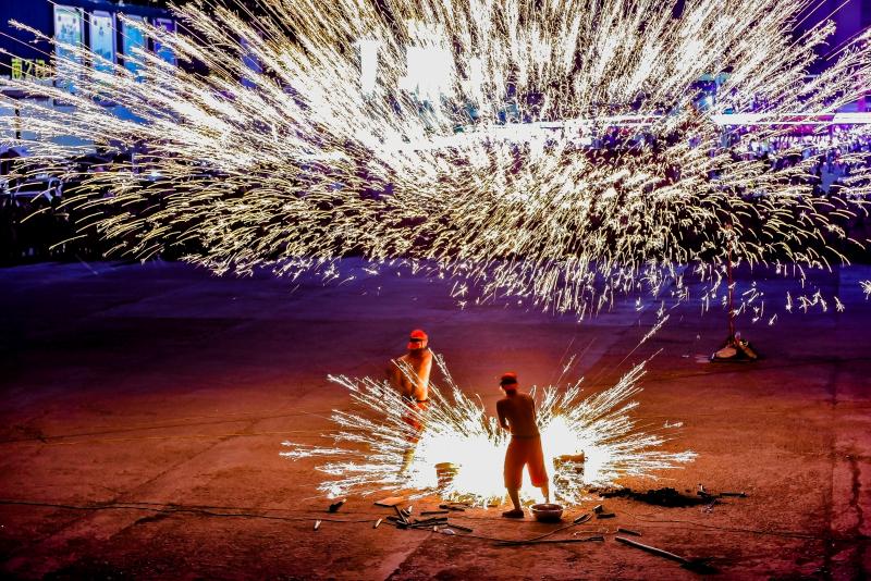 2020年6月7日晚8時(shí)許,吉林長春青岡立交橋附近,打鐵花時(shí),先把熔好的鐵汁注入事先準(zhǔn)備好的“花棒”。一個(gè)拳頭粗細(xì)、一尺多長的柳樹棒,棒的頂端掏有直徑3厘米的圓形坑槽,用以盛放鐵汁。打鐵花者一手拿著盛有鐵汁的“花棒”,用下棒猛擊盛有鐵汁的上棒,使棒中鐵汁沖向花棚,鐵汁遇到棚頂?shù)牧Χ派⒊鼍薮蟮幕鸹?。五彩繽紛、震天動(dòng)地。