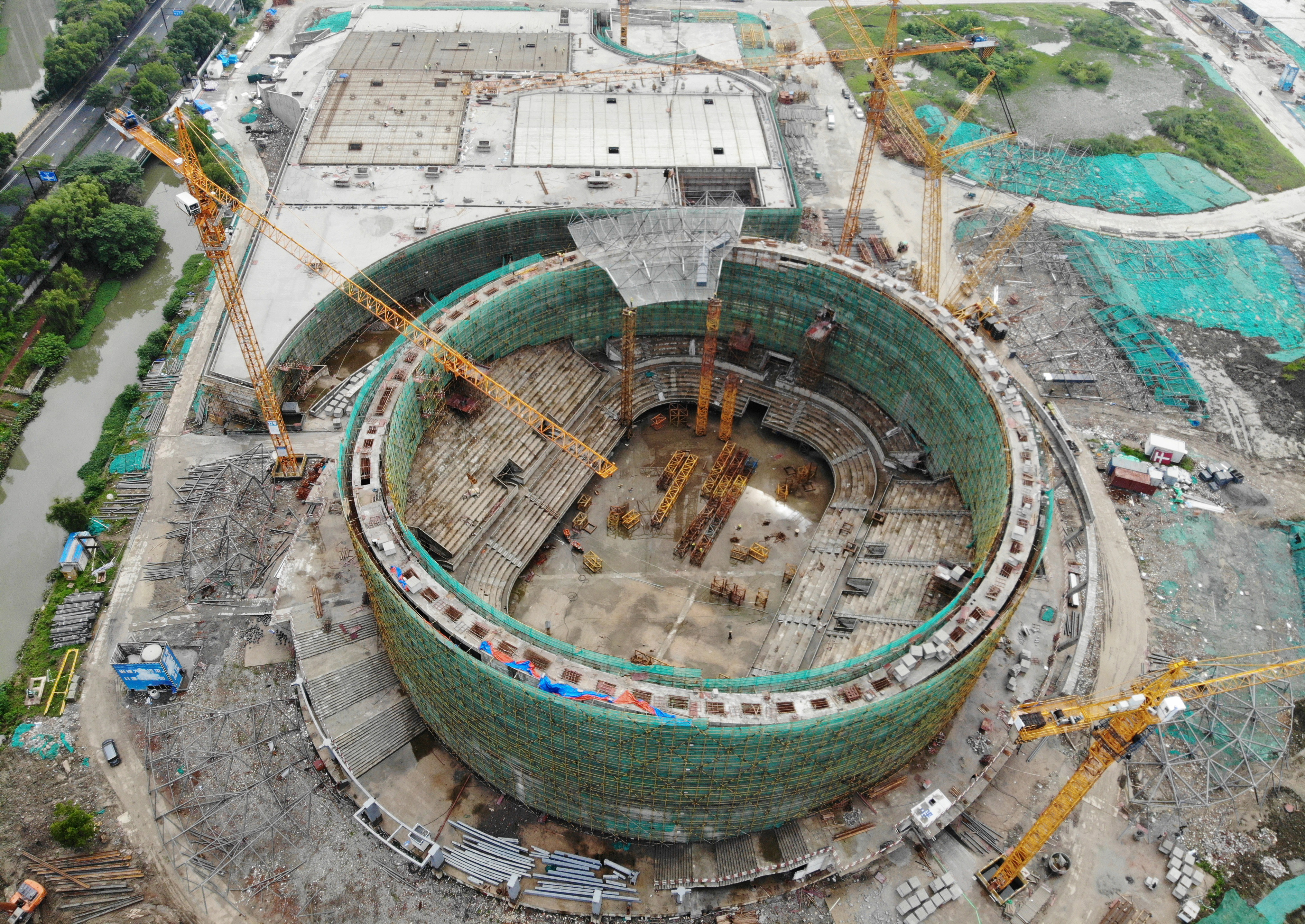 2020年6月9日,從空中俯瞰正在建設(shè)中的杭州亞運(yùn)會(huì)乒乓球館。近日,位于杭州運(yùn)河亞運(yùn)公園內(nèi)的乒乓球館主體結(jié)構(gòu)完工,開始進(jìn)入自支撐鋼斜肋系統(tǒng)玻璃立面安裝階段。據(jù)了解,杭州亞運(yùn)會(huì)乒乓球館占地1.94萬(wàn)平方米,將建成12片標(biāo)準(zhǔn)乒乓球場(chǎng)地,并可容納5000-6500位觀眾。該乒乓球館設(shè)計(jì)靈感來(lái)源于杭州良渚文化中的“玉文化”,采用了“琮”的樣子。