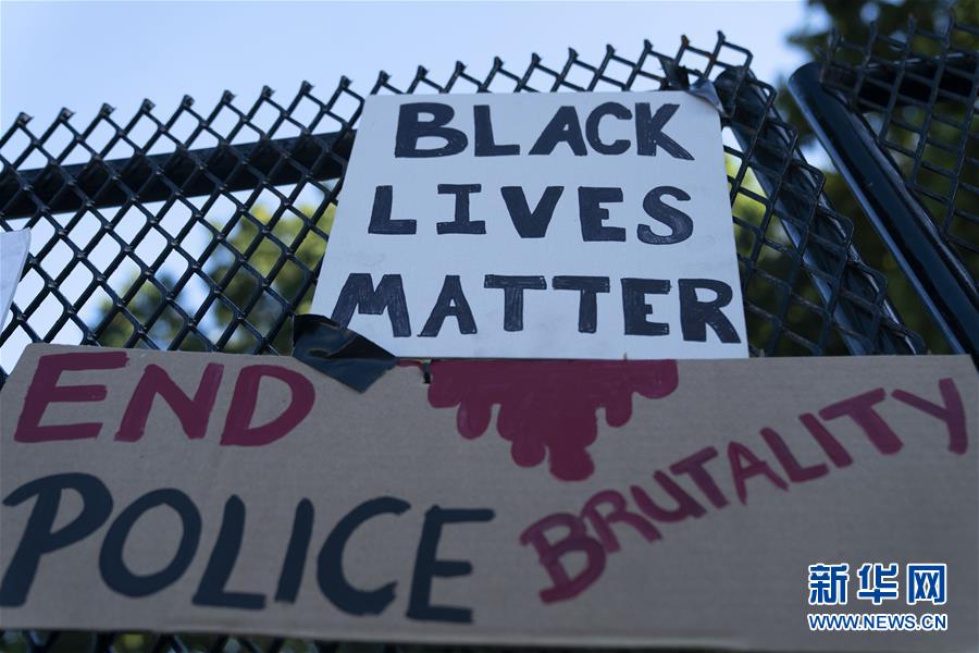 6月8日,美國(guó)華盛頓白宮附近的隔離圍欄上貼著抗議標(biāo)語(yǔ)。新華社記者劉杰攝