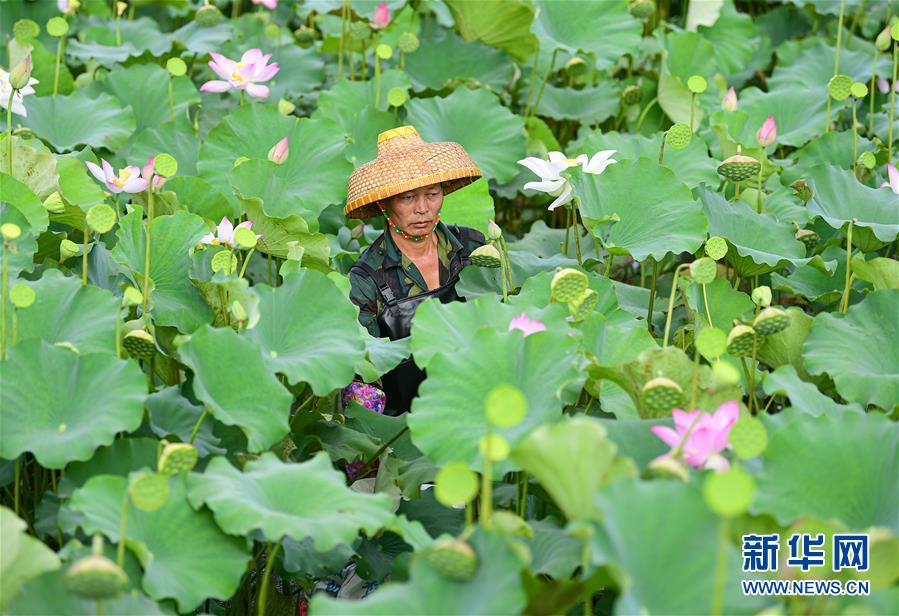 6月9日,村民在??邶埲A區(qū)龍泉鎮(zhèn)美仁坡村采摘蓮蓬。初夏時節(jié),位于海南海口龍華區(qū)龍泉鎮(zhèn)的蓮蓬逐漸成熟,當(dāng)?shù)卮迕窦泳o采摘,一派繁忙景象。新華社記者蒲曉旭攝