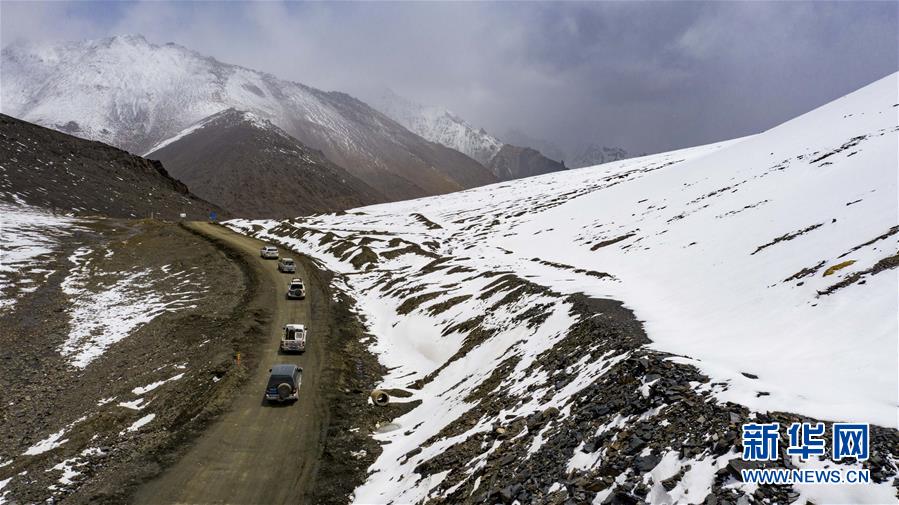 新疆塔什庫爾干塔吉克自治縣文工團演員開車翻越雪山達坂,前往達布達爾鄉(xiāng)熱斯喀木村演出(6月5日攝,無人機照片)。新華社記者胡虎虎攝