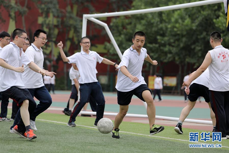 6月9日,河北省衡水市第二中學的高三學生在操場上踢足球。2020年高考臨近,河北省衡水市第二中學組織開展多種形式的集體“減壓”活動,幫助高三學生在緊張備考之余釋放身心壓力,以輕松、樂觀、自信的心態(tài)迎接高考。新華社記者朱旭東攝