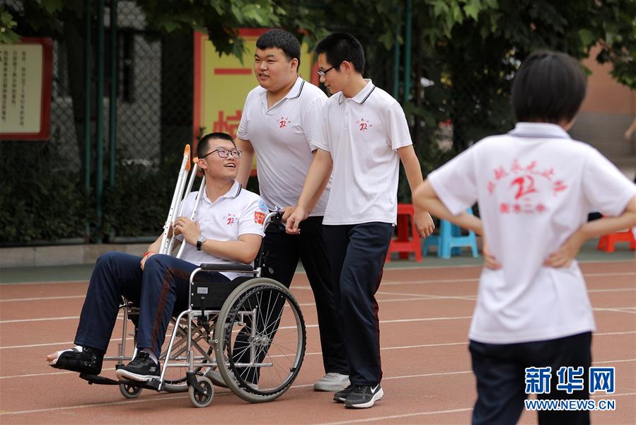 6月9日,河北省衡水市第二中學(xué)的高三學(xué)生推著一名腳部受傷的同學(xué)在操場(chǎng)上聊天散步。2020年高考臨近,河北省衡水市第二中學(xué)組織開(kāi)展多種形式的集體“減壓”活動(dòng),幫助高三學(xué)生在緊張備考之余釋放身心壓力,以輕松、樂(lè)觀、自信的心態(tài)迎接高考。新華社記者朱旭東攝