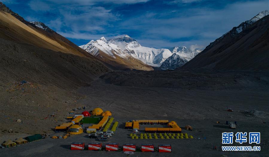 這是海拔5200米的珠峰登山大本營(無人機照片,5月25日攝)。從空中俯瞰珠穆朗瑪峰北坡,生機勃勃的高原濕地、蜿蜒曲折的盤山公路、壯麗秀美的絨布冰川,還有安靜的村莊和熱鬧的登山營地,共同構成一幅壯美畫卷。新華社記者普布扎西攝