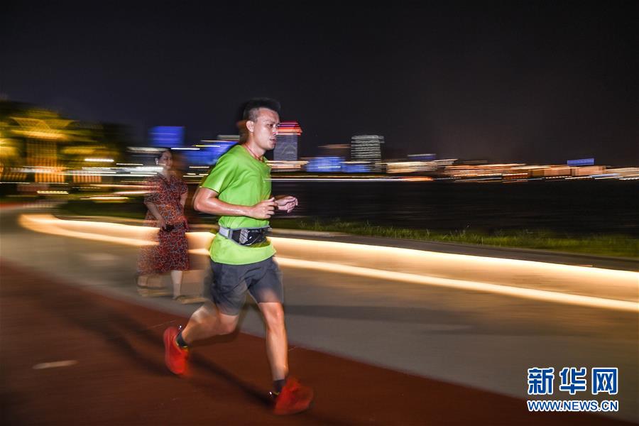 一位市民在海口世紀(jì)公園濱海步道夜跑(5月15日拍攝)。近年來,夜跑成為越來越多都市人熱衷的健身方式之一。在海南???,每當(dāng)夜幕降臨,“夜跑族”來到海口萬綠園、世紀(jì)公園等夜跑場所跑步,用一身酣暢淋漓的汗水?dāng)[脫白天工作中的壓力,享受跑步帶來的歡愉。新華社記者 蒲曉旭 攝