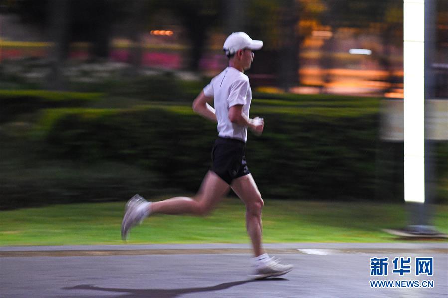 一位市民在??谌f綠園夜跑(5月28日拍攝)。近年來,夜跑成為越來越多都市人熱衷的健身方式之一。在海南???,每當(dāng)夜幕降臨,“夜跑族”來到??谌f綠園、世紀(jì)公園等夜跑場所跑步,用一身酣暢淋漓的汗水?dāng)[脫白天工作中的壓力,享受跑步帶來的歡愉。新華社記者 蒲曉旭 攝