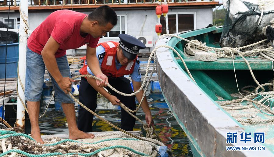 6月13日,海南省公安廳海岸警察總隊(籌備組)陵水支隊民警幫助轄區(qū)內漁民固定漁船。當日,海南省氣象局于16時30分繼續(xù)發(fā)布臺風四級預警。今年第2號臺風“鸚鵡”(熱帶風暴級)預計于14日在廣東沿海登陸。新華社記者楊冠宇攝。