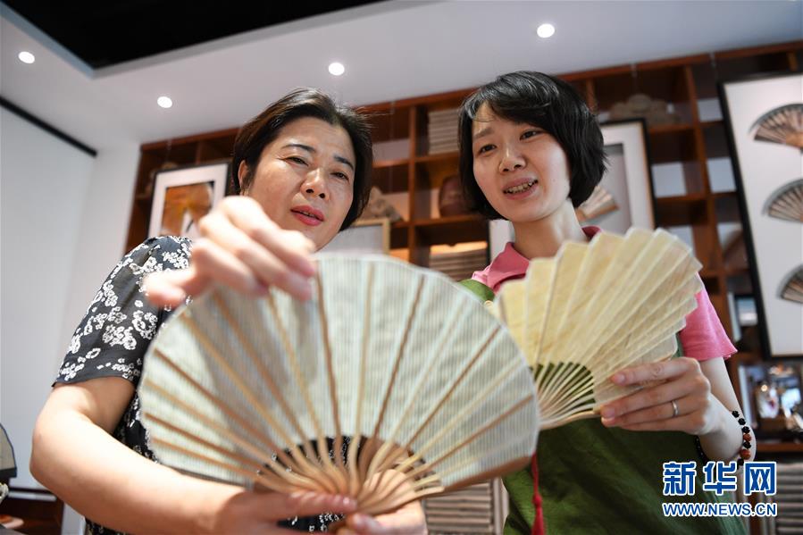 6月12日,非遺傳承人馬仁芬(左)與馬琳沁在探討夏布折扇的設(shè)計(jì)。新華社記者 唐奕 攝