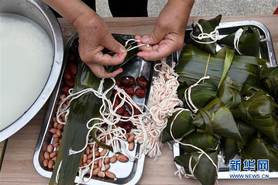 6月17日,水清溝街道居民在社區(qū)廣場(chǎng)上包粽子。新華社記者 李紫恒 攝
