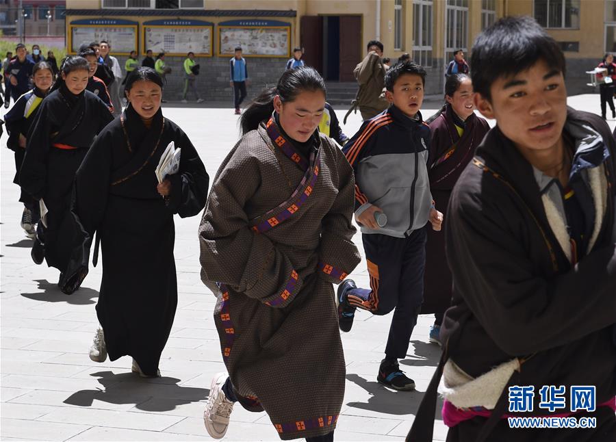 6月14日,阿壩縣藏文中學(xué)學(xué)生午休后步入教室準(zhǔn)備上課。新華社記者 劉坤 攝