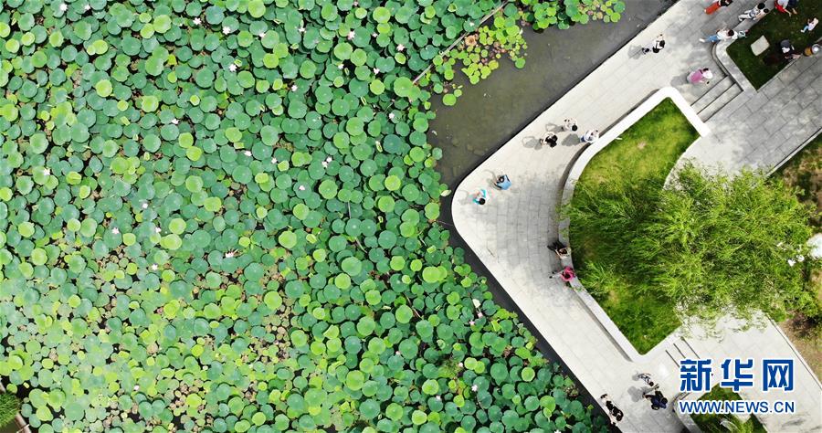 6月19日拍攝的大明湖畔的荷花池(無人機(jī)照片)。近日,山東濟(jì)南大明湖的荷花陸續(xù)綻放,吸引游客前來觀賞。新華社記者 王凱 攝