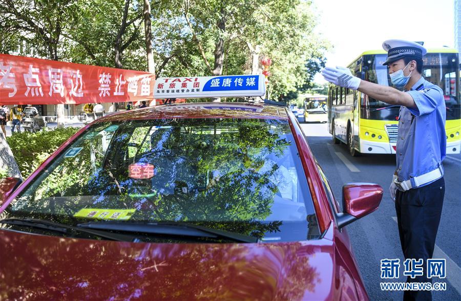 6月20日,在烏魯木齊市第十一中學門前,烏魯木齊市公安局交警支隊天山區(qū)大隊新華路中隊警官肖健波提醒過往車輛減速慢行、禁止鳴笛。當日,烏魯木齊市初中升高中考試開始。為保障為期三天的中考順利進行,烏魯木齊市公安局交警支隊在各考點執(zhí)勤,為考生保駕護航新華社記者 王菲 攝