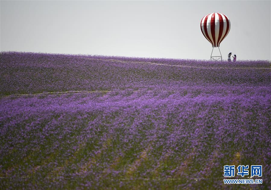 游客在寧夏艾伊薰衣草生態(tài)基地的馬鞭草花海中自拍(6月20日攝)。新華社記者王鵬攝