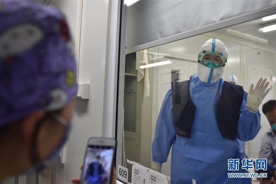 6月19日,在北京地壇醫(yī)院隔離病房內(nèi),護(hù)士穿上同事送來的降溫馬甲后,向同事打招呼感謝。新華社記者彭子洋攝