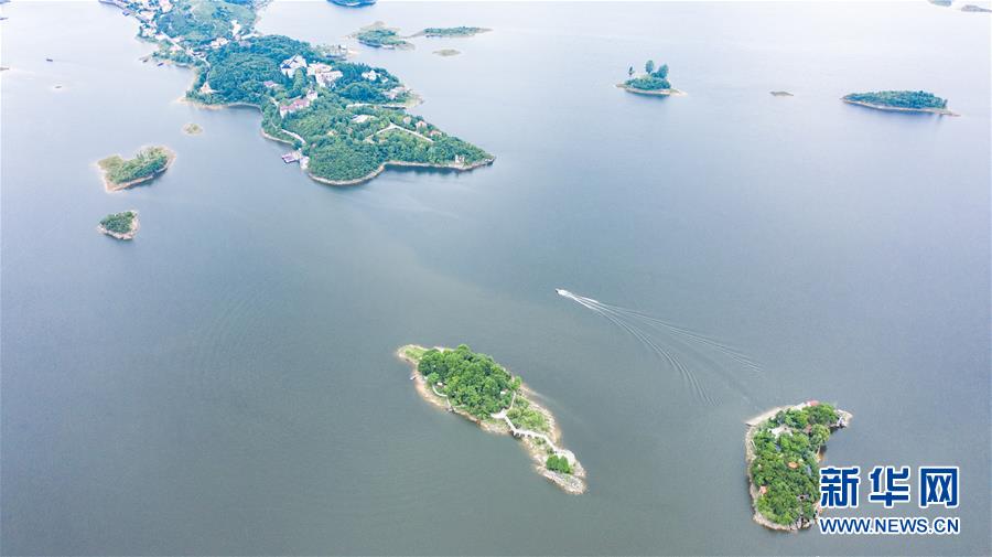 6月21日,游客乘船在紅楓湖景區(qū)游覽(無人機(jī)照片)。夏至?xí)r節(jié),貴州省清鎮(zhèn)市紅楓湖景區(qū)草木蒼翠,秀麗的湖光山色吸引不少游客前來游玩。新華社記者陶亮攝