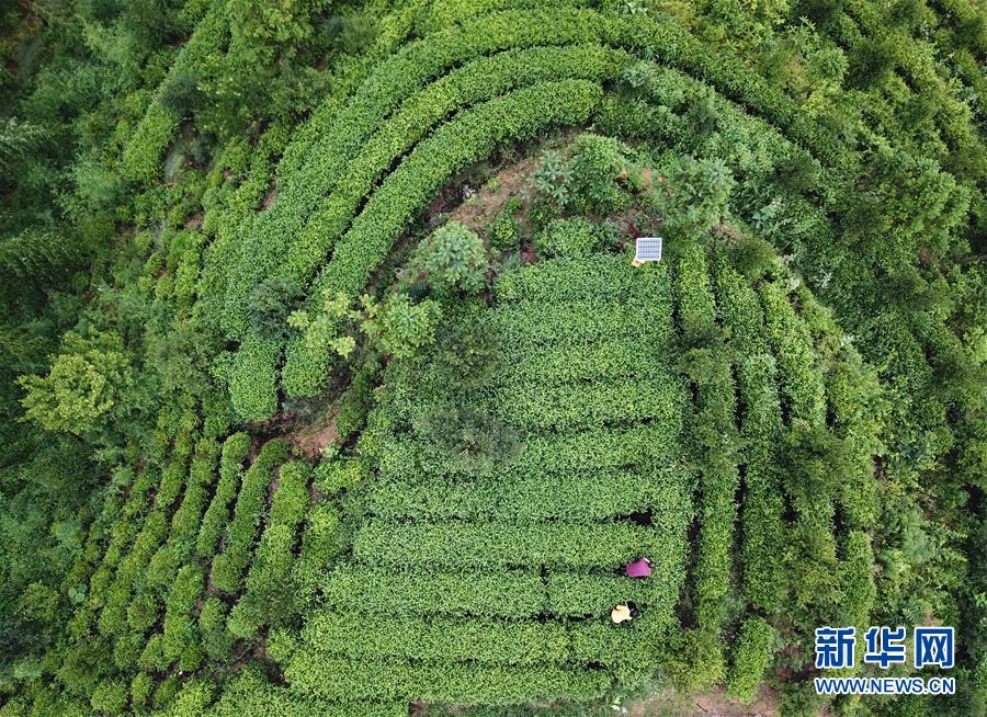 蔡齊艷和爸爸蔡守偉在自家茶園里拔草(6月20日無人機照片)。新華社記者張端攝