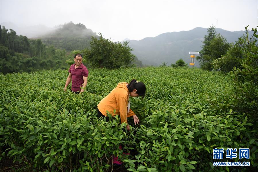 6月20日,蔡齊艷和爸爸蔡守偉在自家茶園里拔草。新華社記者劉軍喜攝