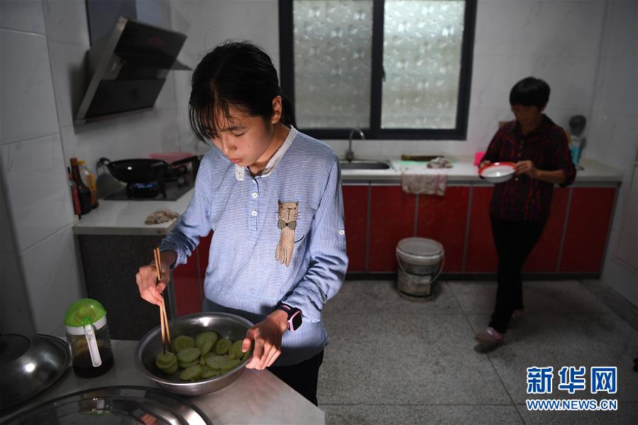 6月19日,蔡齊艷在家里幫媽媽準備晚餐。新華社記者劉軍喜攝