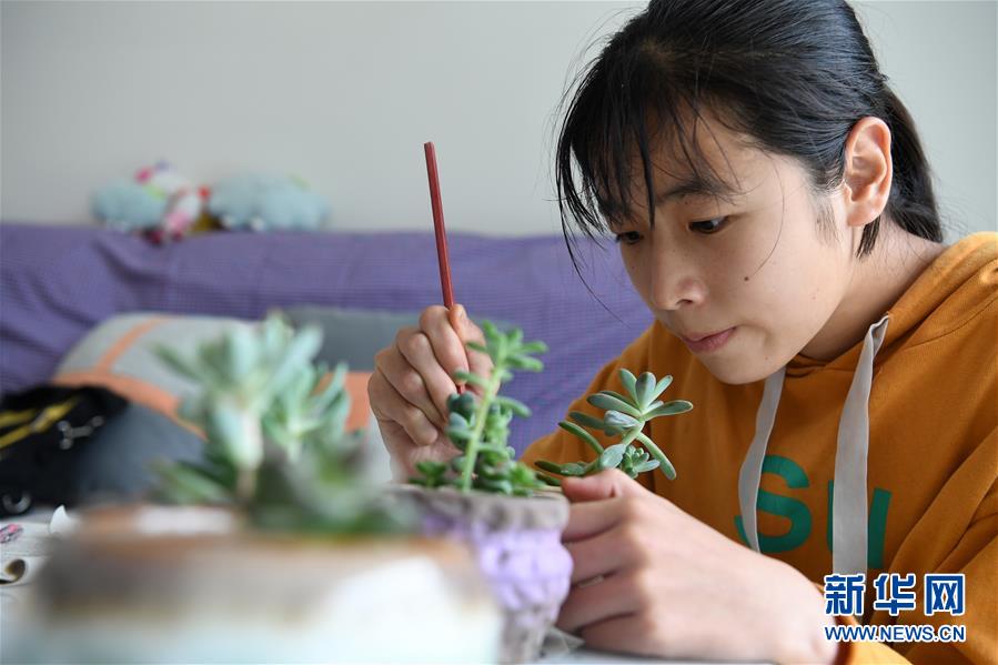 6月20日,蔡齊艷在家中打理多肉植物。新華社記者劉軍喜攝