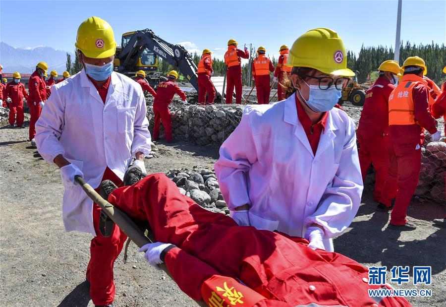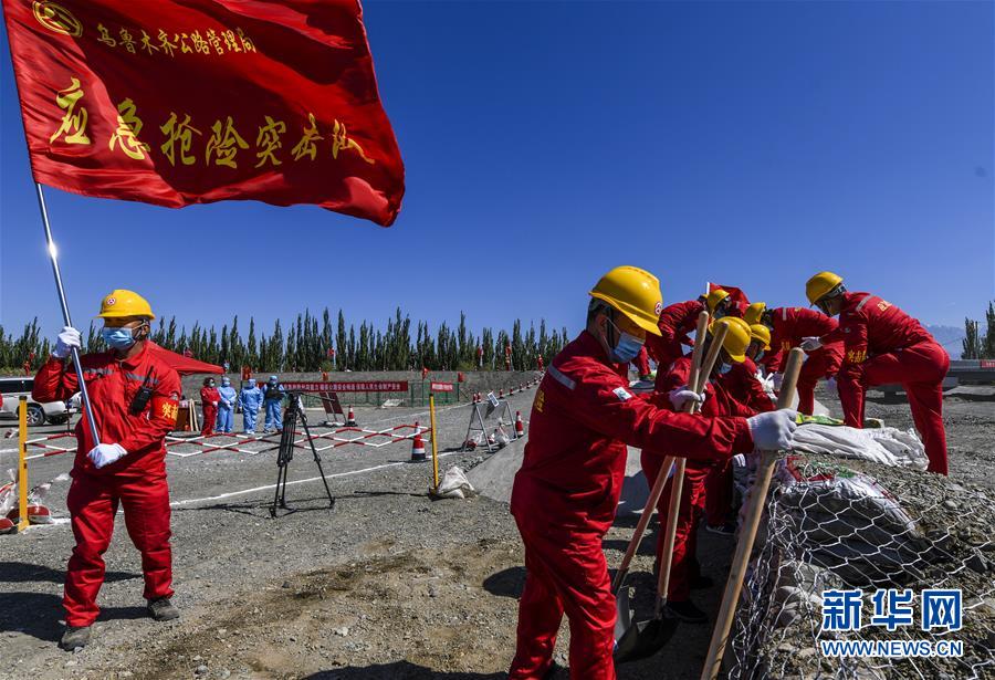 6月22日,應(yīng)急搶險隊員參加演練。當日,新疆維吾爾自治區(qū)公路管理局組織的2020年國省干線公路突發(fā)地質(zhì)災害應(yīng)急演練在烏魯木齊舉行,演練模擬烏魯木齊市柴窩堡區(qū)域遭受強降雨,誘發(fā)附近水域突發(fā)洪水,公路路基面臨被洪水沖毀的險情,組織搶險人員和機械設(shè)備在指定時間內(nèi)趕赴受災現(xiàn)場實施應(yīng)急搶險處置。此次演練將進一步增強各相關(guān)部門的防災減災意識,提高公路應(yīng)急搶險處突能力。新華社記者王菲攝