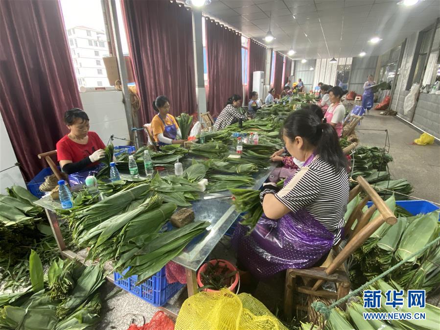 6月18日,在湖南省張家界市桑植縣,康華粽葉扶貧工廠的工人在搬運粽葉。新華社記者阮周圍攝