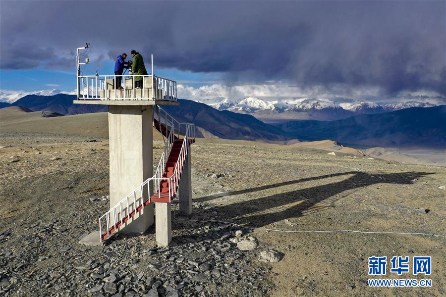 在中國(guó)科學(xué)院新疆天文臺(tái)慕士塔格觀測(cè)站,馮國(guó)杰和助理觀測(cè)員在戶外工作(6月15日攝,無(wú)人機(jī)照片)。新華社記者胡虎虎攝