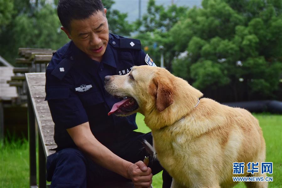 6月24日,緝毒犬“多多”完成訓(xùn)練后,與訓(xùn)導(dǎo)員周吉榮親密互動。 新華社記者 鄭夢雨 攝